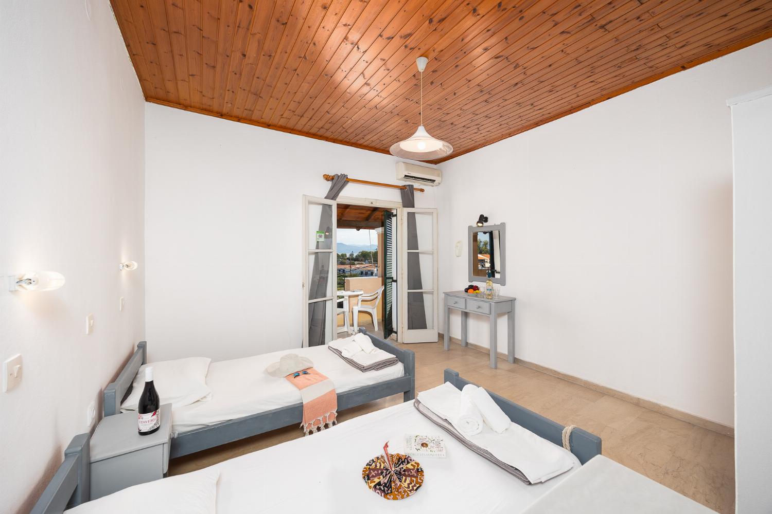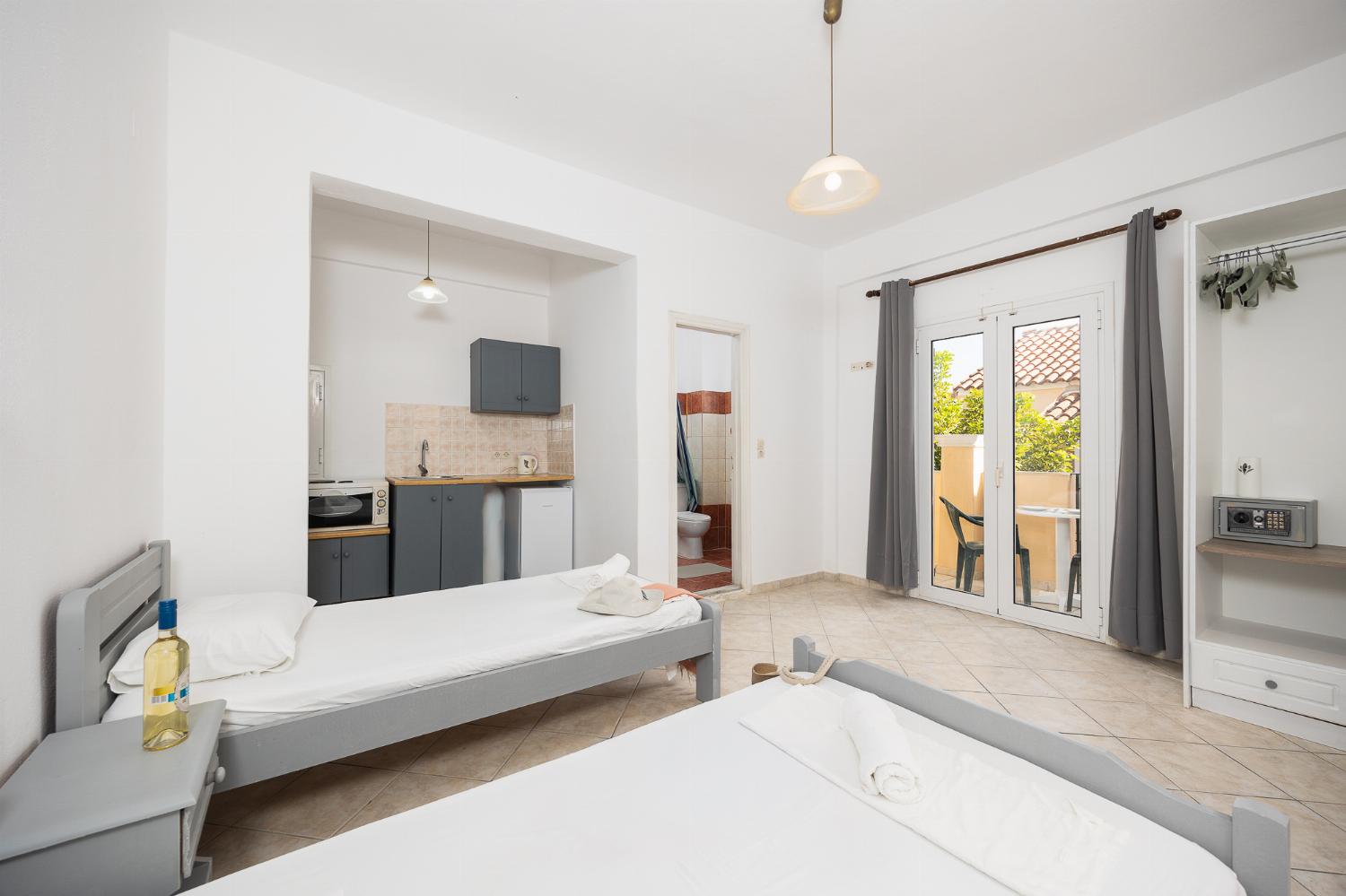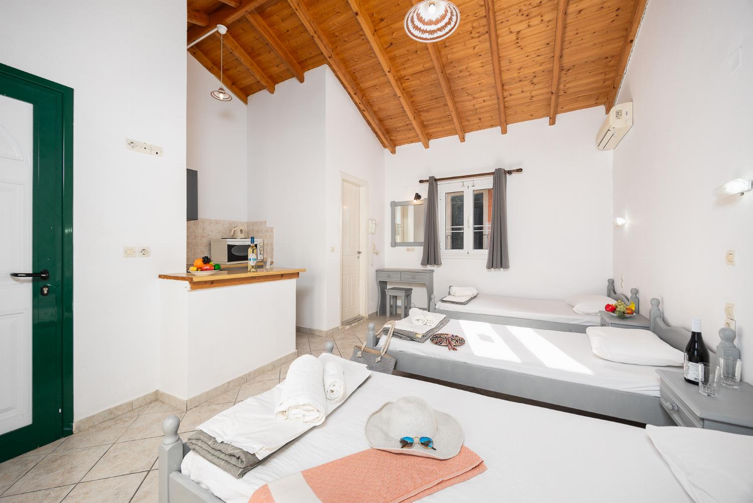Spacious studio with a private balcony overlooking the surroundings. Equipped with two comfortable single beds, air conditioning, and modern amenities. Ideal for relaxing stays with plenty of natural light and fresh air.
