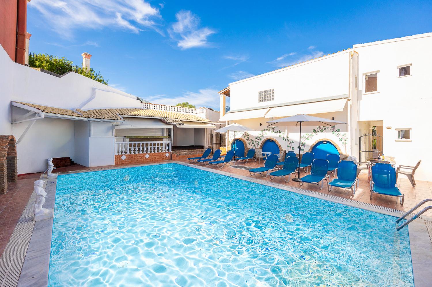 Bright family studio with four comfortable single beds and a private balcony overlooking the pool. Perfect for families or groups seeking comfort and space. Enjoy relaxing moments with pool views and modern amenities.